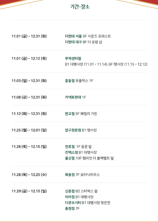 | ◾ 더현대 서울 5층 사운즈 포레스트 (서울 영등포구 여의대로 108) ◾ [기간] 2024.11.01 ~ 2024.12.31 (*11월 11일 휴무) ◾ [시간] 매일 10:30 ~ 19:30 ◾ [가격] 무료 |